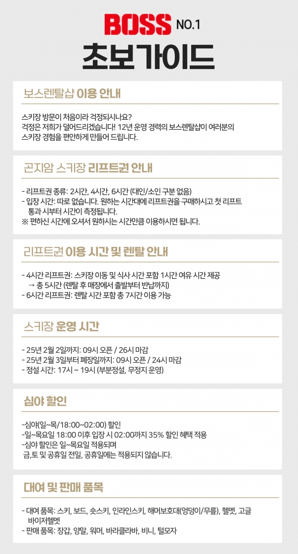 작성자 : BOSS 곤지암스키렌탈샵(test@test.com) 작성일 : 2025-01-21 조회수 : 1209